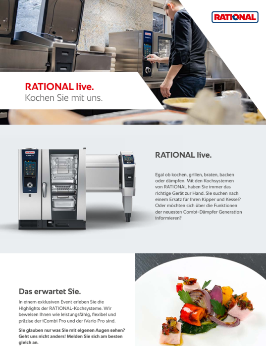 In einem exklusiven Event erleben Sie die Highlights der RATIONAL-Kochsysteme. Wir beweisen Ihnen wie leistungsfähig, flexibel und präzise der iCombi Pro und der iVario Pro sind. Sie glauben nur was Sie mit eigenen Augen sehen? Geht uns nicht anders! Melden Sie sich am besten gleich an.